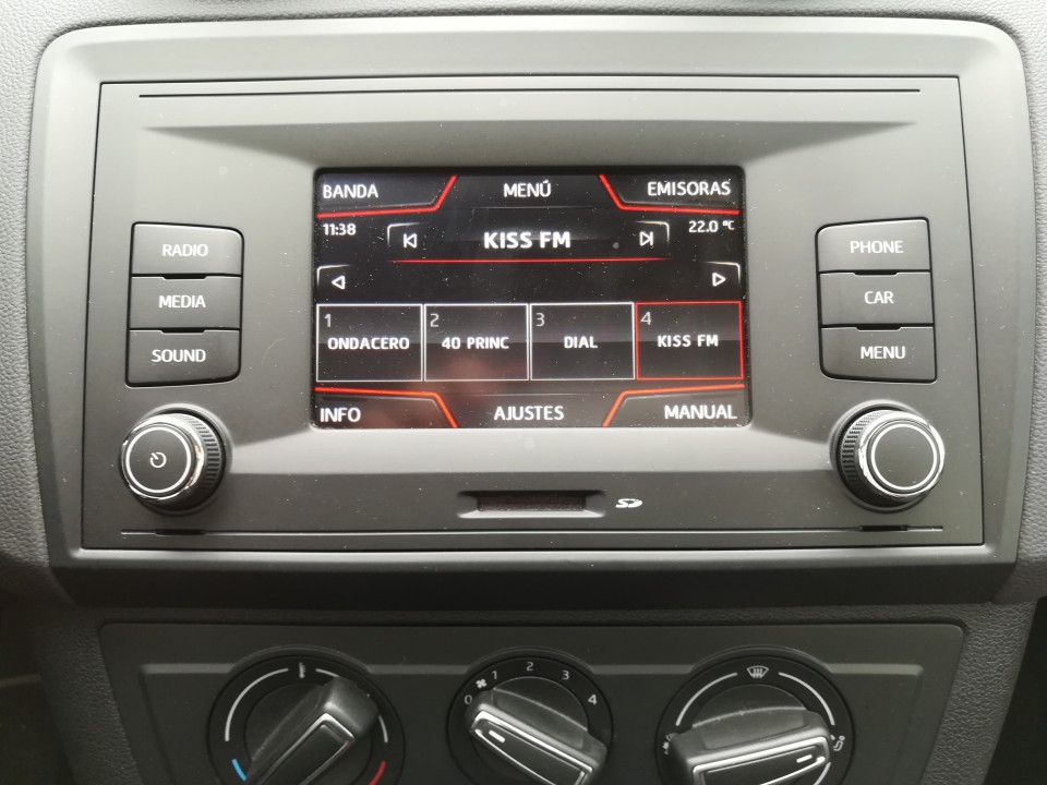 Equipo multimedia con pantalla táctil, radio FM/AM, conexiones USB, tarjeta SD y AUX