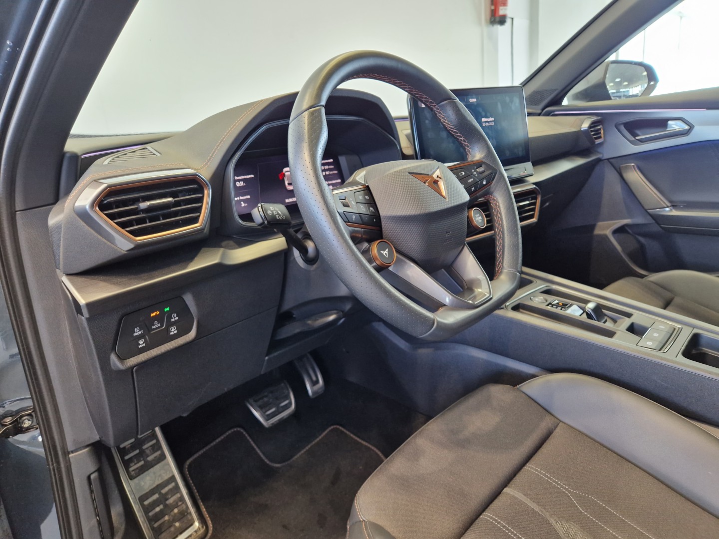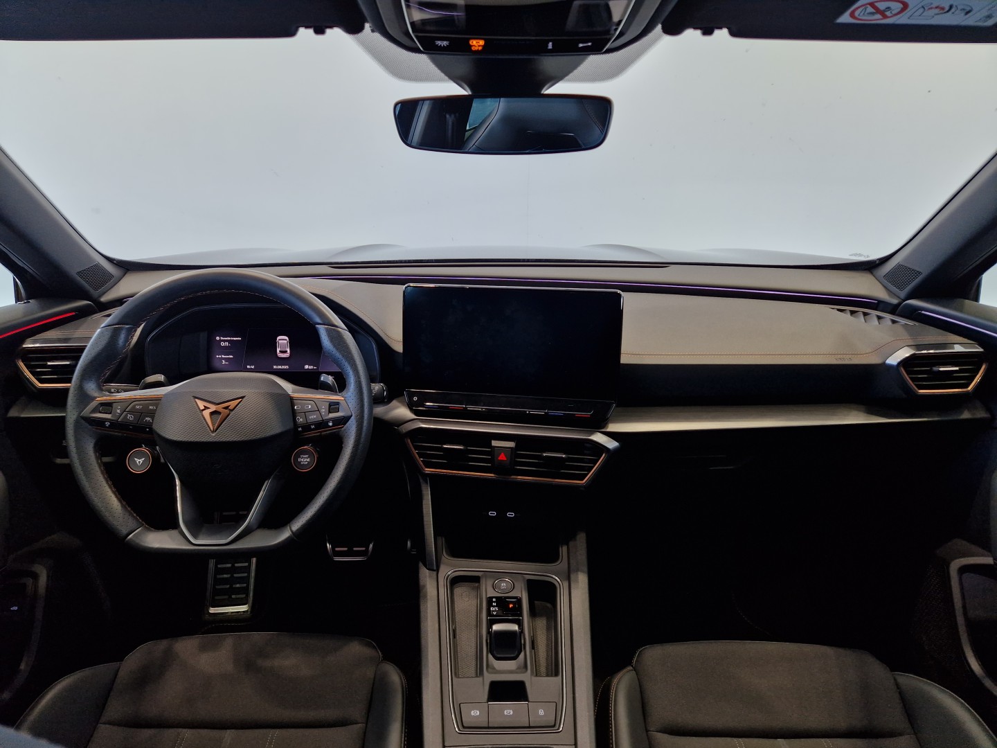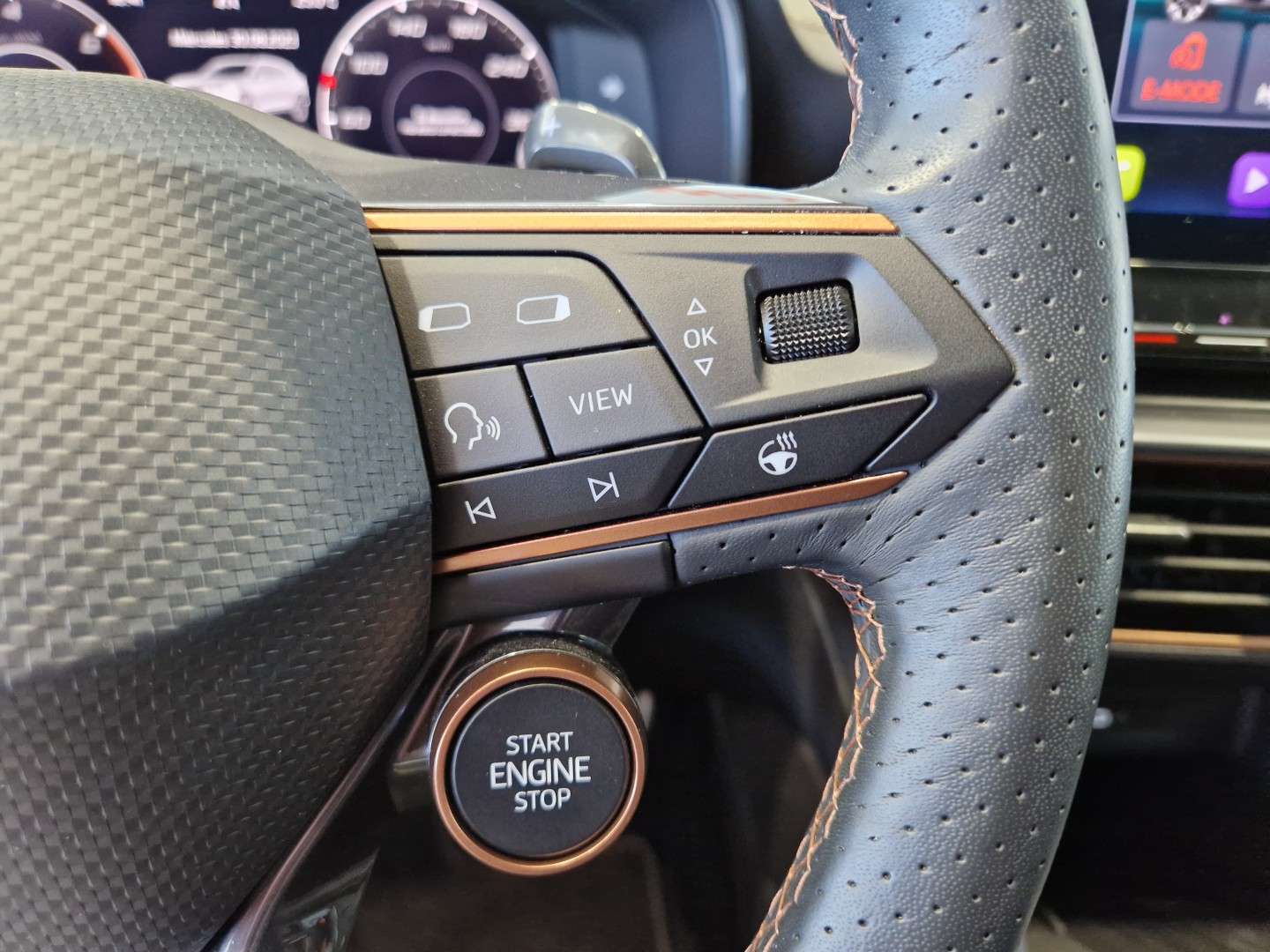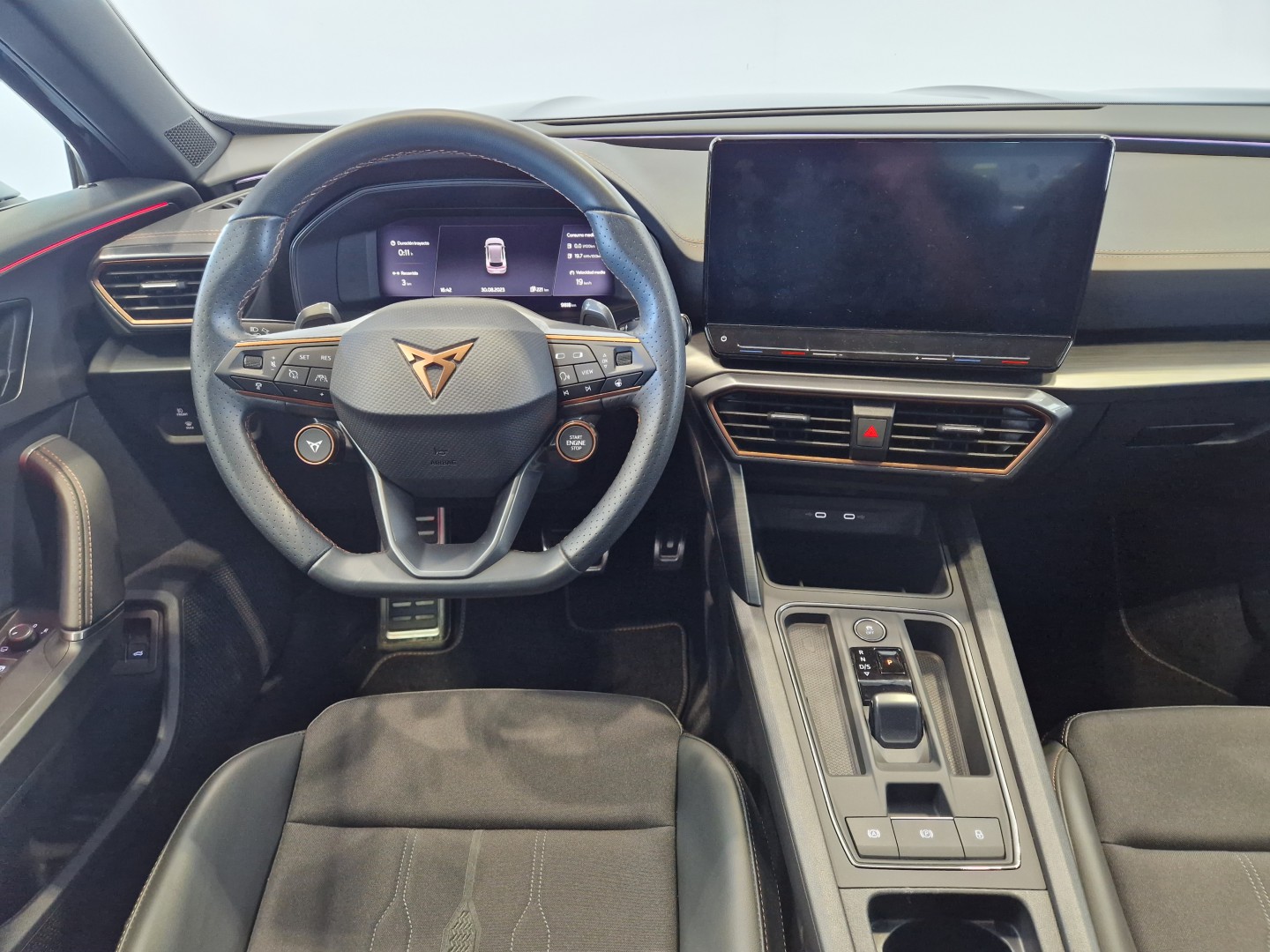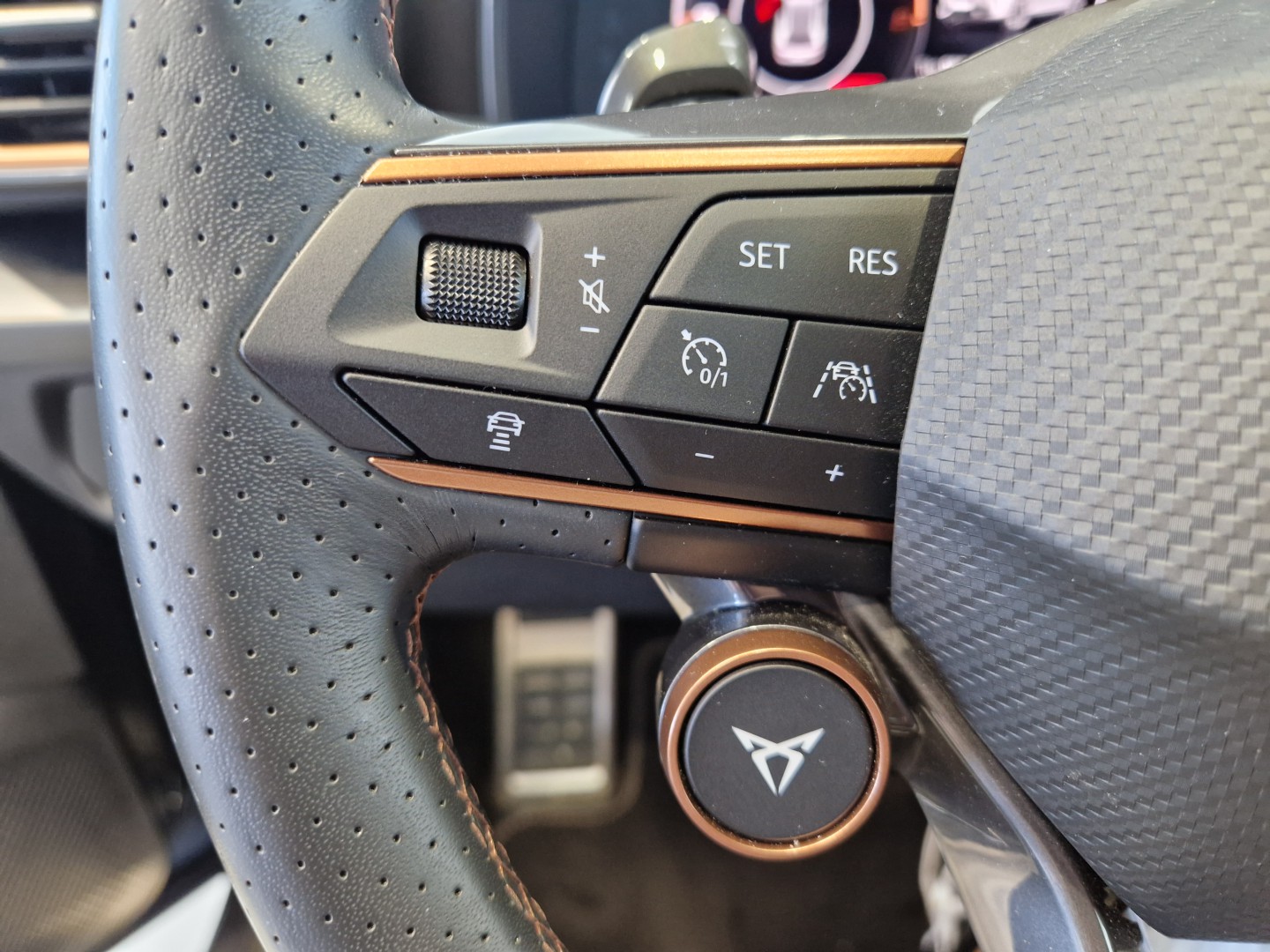 Volante superdeportivo en piel calefactable, botones integrados, modo CUPRA y levas de cambio